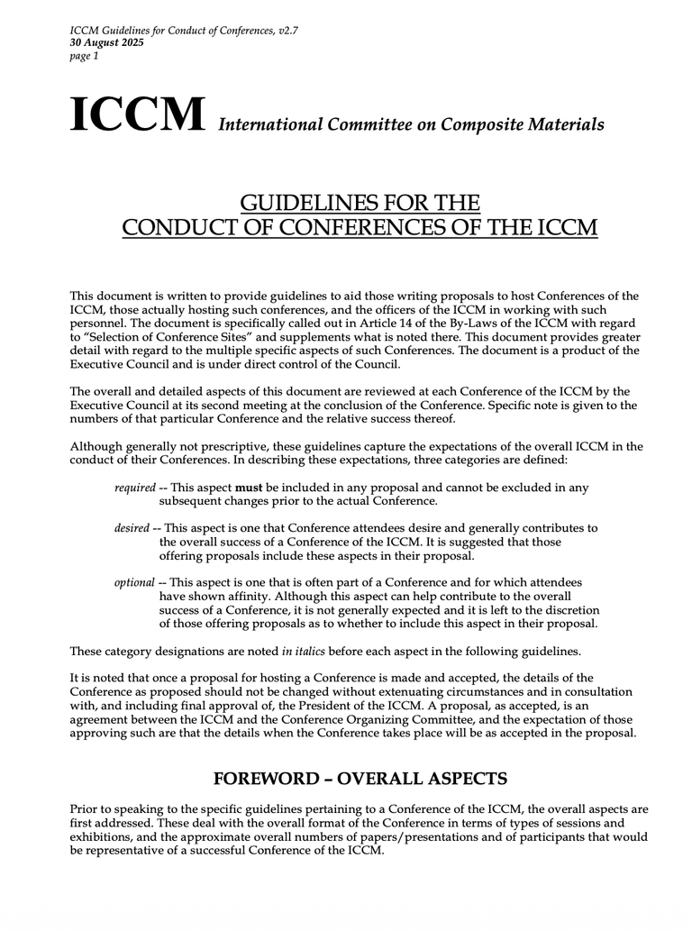 This document is written to provide guidelines to aid those writing proposals to host ICCM Conferences, those actually hosting such conferences, and the officers of the ICCM in working with such personnel. The document is specifically called out in Article 14 of the By-Laws of the ICCM with regard to “Selection of Conference Sites” and supplements what is noted there. This document provides greater detail with regard to the multiple specific aspects of such Conferences. The document is a product of the Executive Council and is under direct control of the Council